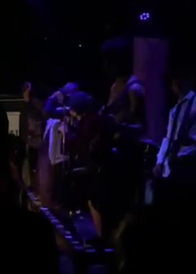 A live band performs on stage in a dimly lit music venue