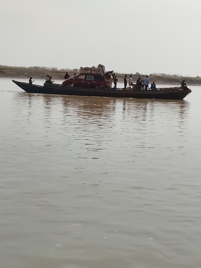 - "A long, dark-hulled wooden ferry-type boat is observed traversing a wide, murky brown river in the vicinity of Ibi, Nigeria" by FM-m079f2, licensed under CC BY 4.0