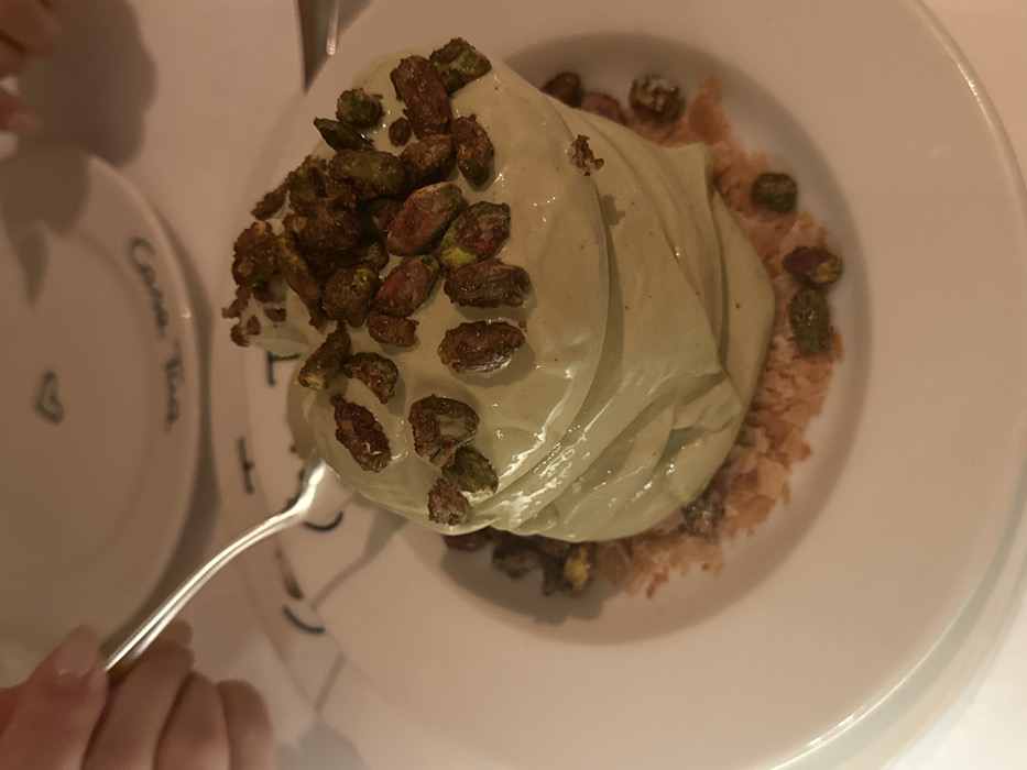 A plate holds a dessert featuring light green, layered cream or mousse, generously topped with glazed pistachios