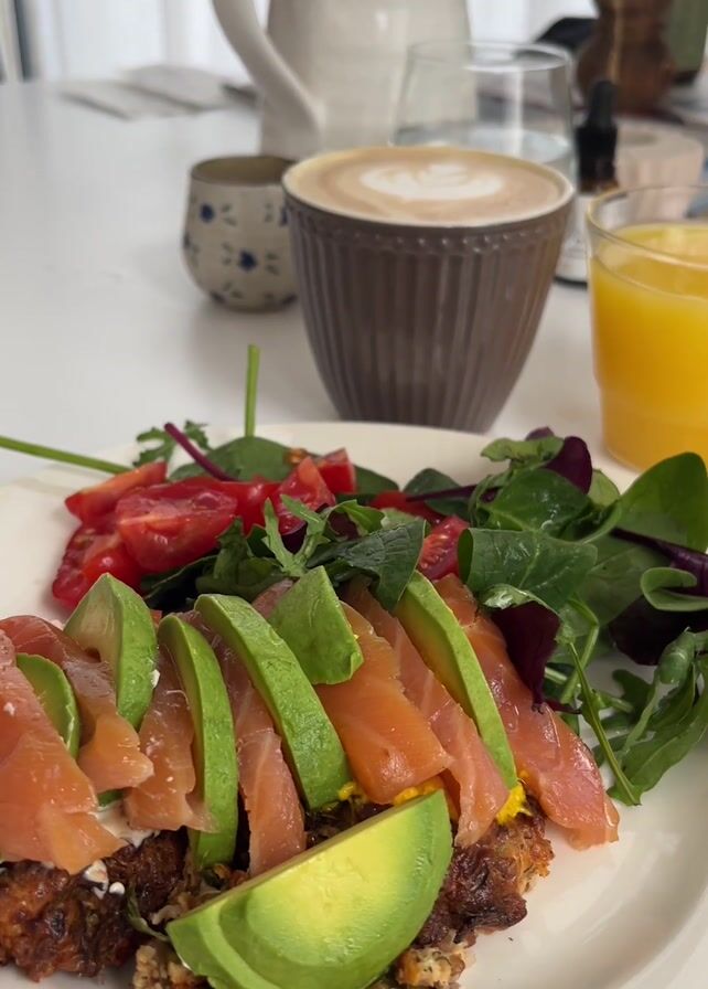 The camera focuses on a white plate arranged on a white table. The plate contains a dish consisting of a base made of some kind of fried patty, topped with cream cheese, slices of avocado, and salmon. A small salad of greens and halved cherry tomatoes is alongside the topped patty. Behind the plate is a mug filled with a latte and a glass filled with orange juice. In the background, behind the drinks, are a water pitcher, a small ceramic jar, and miscellaneous bottles. At the beginning of the clip a child makes a small, short exclamation. There are also some sounds of chewing at the start of the clip.