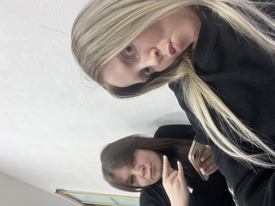 Two girls pose from below against a white ceiling. The top girl has long blonde hair, light eyes, and wears a black top. She makes a puckered lips expression. The lower girl has brown hair, and is holding a phone with a reflective surface. She wears a black top and holds up two fingers in a peace sign. A window frame is visible in the lower left. The image has been rotated.