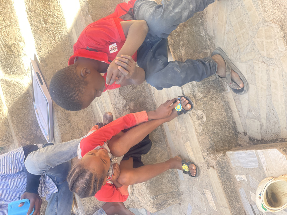 The image depicts an outdoor scene in Jos, Nigeria, featuring three individuals seated on concrete steps under bright daylight. In the foreground, a young girl, approximately 6-10 years old, with dark braided hair, wears a red and grey long-sleeved top and a dark skirt. She is seated, looking down at her left foot, and is shown adjusting a black sandal adorned with a yellow and blue flower embellishment. To her right, a young boy of similar age, with short dark hair, wears a red polo shirt with a white logo on the left chest and dark trousers. He is seated on a lower step, gazing intently at a small object held within his clasped hands. He wears grey flip-flops. In the upper left background, the lower body of an adult is visible, seated on a higher step, dressed in a light blue and white striped long-sleeved shirt and blue jeans, holding a light blue plastic container in their left hand. A white and grey electronic device, possibly a portable scale or tablet, rests on a step behind the children. On the ground level to the far left, a single light-colored Croc-style shoe is present. The environment consists of rough, light grey concrete steps and a patterned ground surface composed of irregular light-colored tiles, all illuminated by strong overhead sunlight casting distinct shadows.