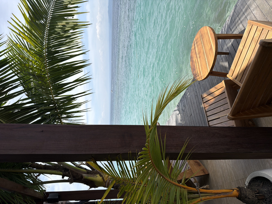 The image displays an unoccupied outdoor wooden deck overlooking the ocean in Batununggul, Indonesia. A dark-stained wooden support column stands prominently on the left, flanked by a large palm frond extending from the top and a smaller potted palm plant in a white container at the lower left. The deck is furnished with a round wooden table and two slatted wooden chairs, positioned with the ocean directly beyond. The water is clear and turquoise, transitioning to a deeper blue on the horizon, where a distant landmass is visible. A small white boat is discernible on the water in the middle distance. The sky is partially cloudy, and sunlight casts distinct shadows across the wooden surfaces.
