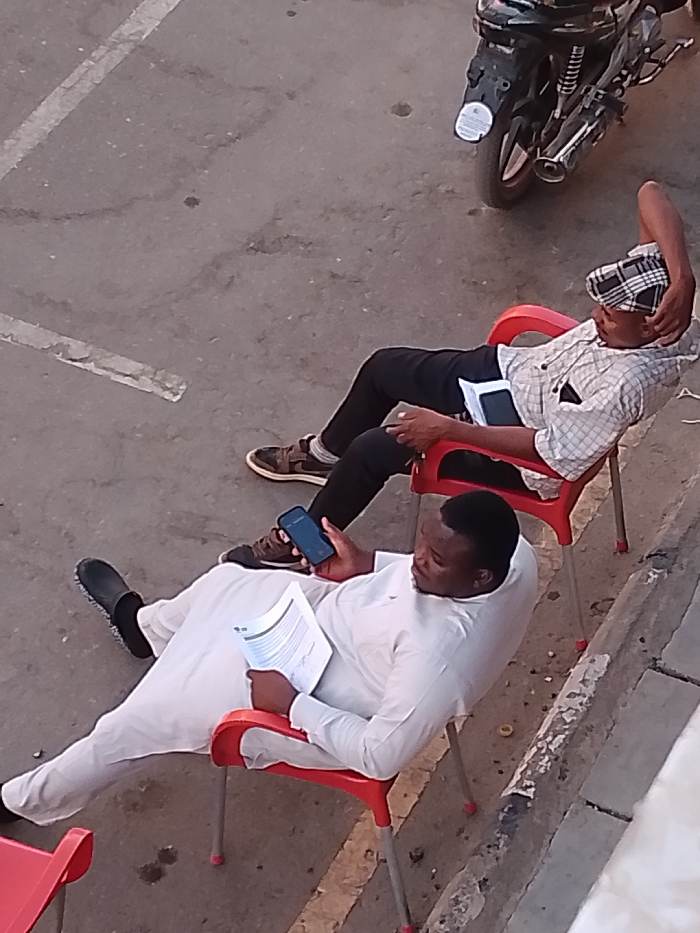 Two adult males are seated in red plastic chairs on a paved surface in Fagge A, Nigeria