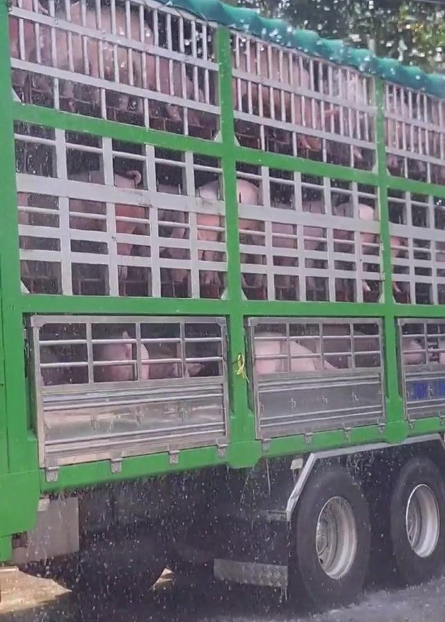 - "green truck filled with pigs, being sprayed with water" by FM-7pWFn2, licensed under CC BY 4.0