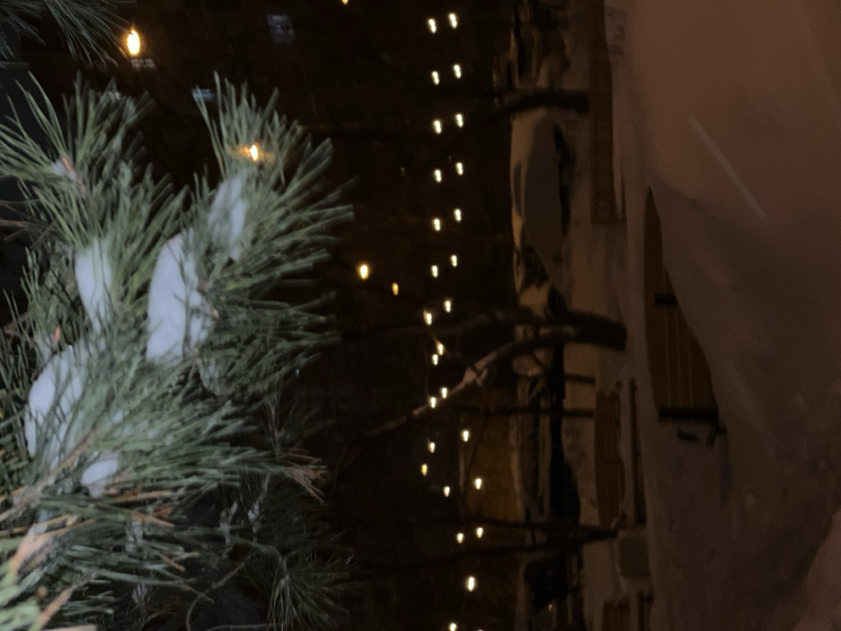 A dark, blurry image depicts a snow-laden pine branch on the left. A line of small, warm-toned lights cascades vertically through the center of the frame, suggesting a holiday or celebratory setting. To the right, a light-colored, possibly snow-covered structure is visible, adding to the wintery atmosphere. The overall impression is one of nighttime, quiet, and festive tranquility.