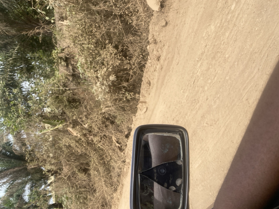 The image presents a view from the passenger side of a vehicle on a dirt road in Ibillo, Nigeria