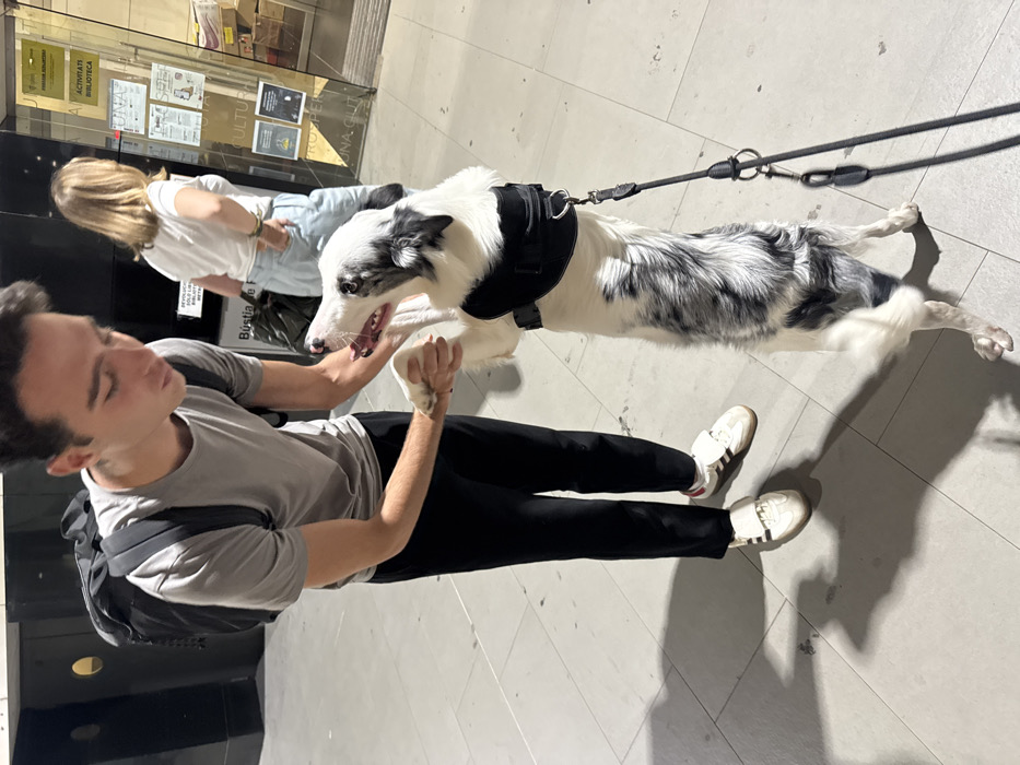 - "An outdoor nighttime scene in Torrent, Spain, depicts a young adult male interacting with a dog in front of a modern building identified by visible signage as a library or cultural center" by FM-KPmEA3, licensed under CC BY 4.0