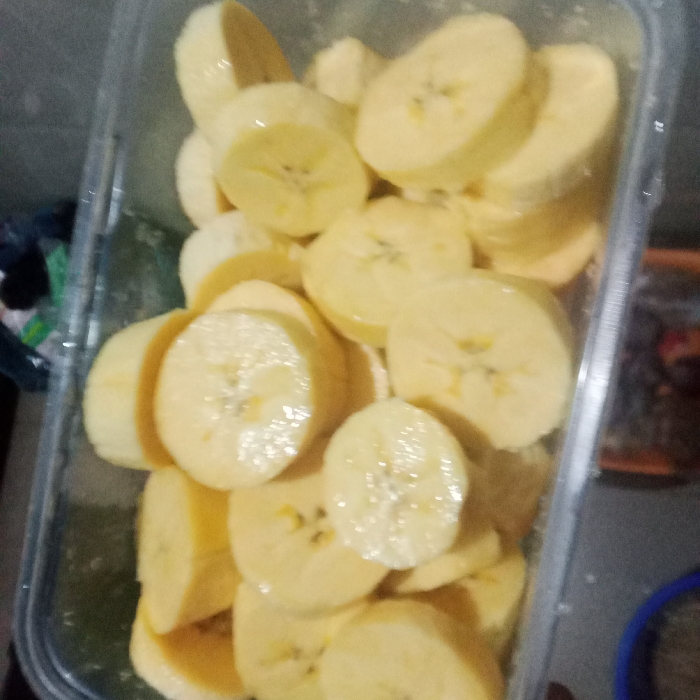 - "An unknown indoor location in the city of Unknown, Unknown, displays a transparent, rectangular plastic container filled with numerous uniformly sliced, circular pieces of light yellow fruit, consistent with peeled plantains or unripe bananas" by FM-qjhjS2, licensed under CC BY 4.0