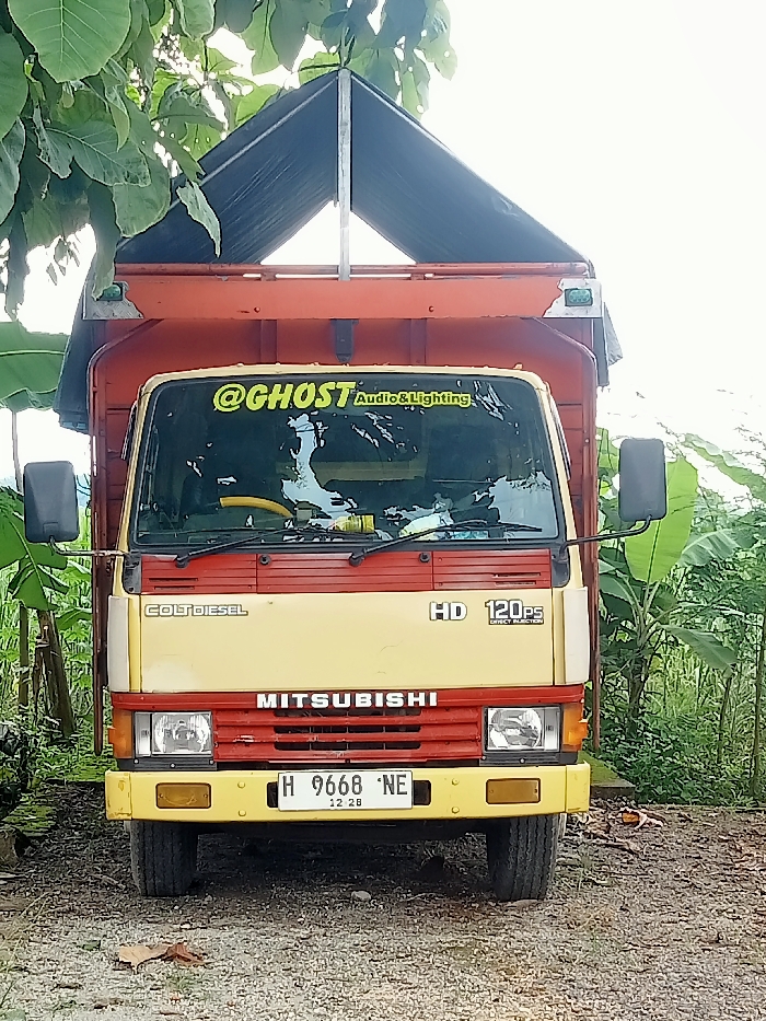 A Mitsubishi Colt Diesel truck is centered in the frame. The truck's front features a two-tone color scheme of cream and orange, with a red grill and yellow bumper. A sticker reading "@GHOST Audio&Lighting" adorns the windshield. "COLT DIESEL" and "HD 120PS" are visible on the cab. The license plate reads "H 9668 NE." A black tarp covers the cargo bed. The truck is parked on a dirt surface, with lush green foliage in the background and surrounding the vehicle.