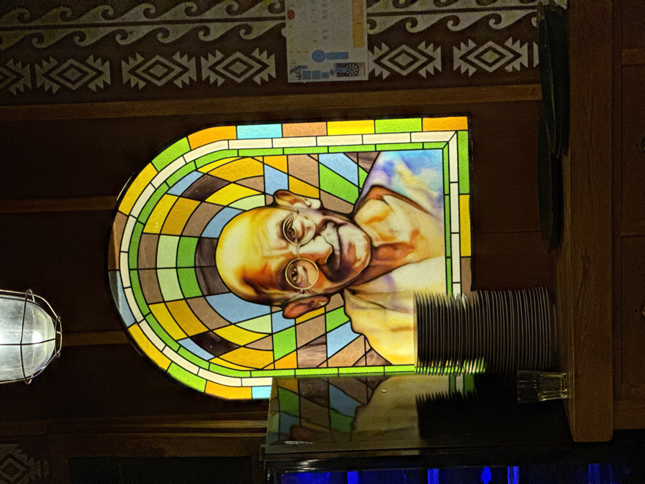 An indoor scene, likely a commercial establishment such as a restaurant, in Noumea, France, is depicted under subdued lighting. The central feature is a large, arched stained glass window portraying Mahatma Gandhi from the chest up, smiling and wearing round spectacles, against a multi-colored geometric background. Above the window, an industrial-style overhead light fixture with a wire cage emits a soft glow. Below the window, a wooden counter holds a tall stack of approximately 30 white plates, a single clear glass tumbler to its left, and two dark, shallow serving dishes to its right. To the far left, a reflective vertical surface, possibly a beverage cooler, emits a blue light. The wall to the right of the stained glass features dark paneling adorned with a repetitive, lighter-colored geometric pattern. A small, partially visible sign or poster, including a dartboard icon, is affixed to this patterned wall section. No individuals are present.