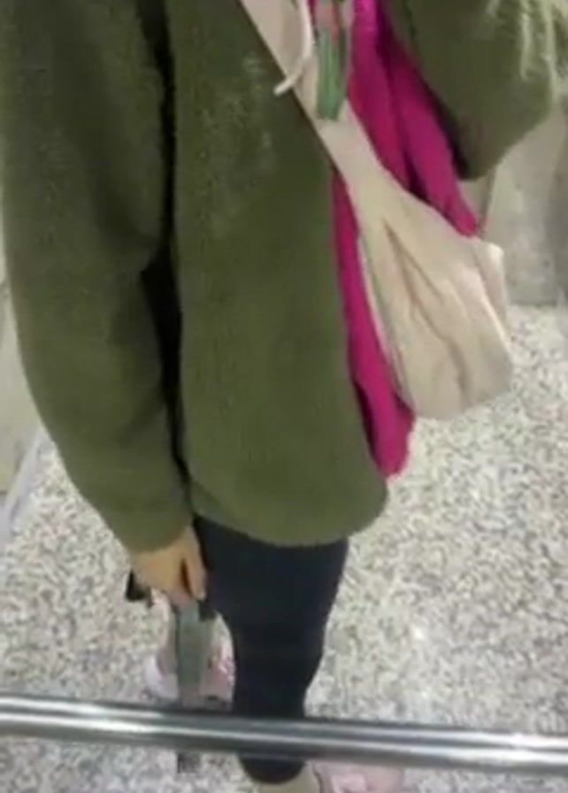 A person wearing an olive green fuzzy jacket, black leggings, and light pink sneakers stands inside an elevator. The elevator floor has a speckled gray and white pattern. The person is also wearing a pink top or scarf and a light pink crossbody bag with a tassel. The person moves slightly within the elevator, but does not interact with any other people or objects. There is a metal railing in front of them. The view is from the chest down, angled downwards towards the floor.