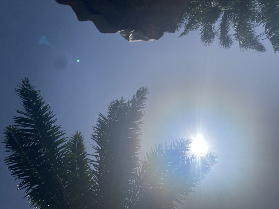 The image depicts an outdoor scene in Takau, Nigeria, under a clear, bright blue sky. Dark, silhouetted fronds of palm trees frame the upper-left and lower-left portions of the frame. The sun, positioned in the lower-left quadrant, generates a prominent lens flare with a bright white center and a multi-colored, rainbow-like halo, which partially obscures the lower palm fronds and extends across the lower-left sky. In the upper-right quadrant, a large, dark, irregularly shaped mass, consistent with a building or natural rock formation, is silhouetted against the sky. A distinct, small, bright green circular artifact, indicative of a lens flare, is visible in the upper-middle section of the sky. No individuals, actions, or specific interactions are present within the frame.