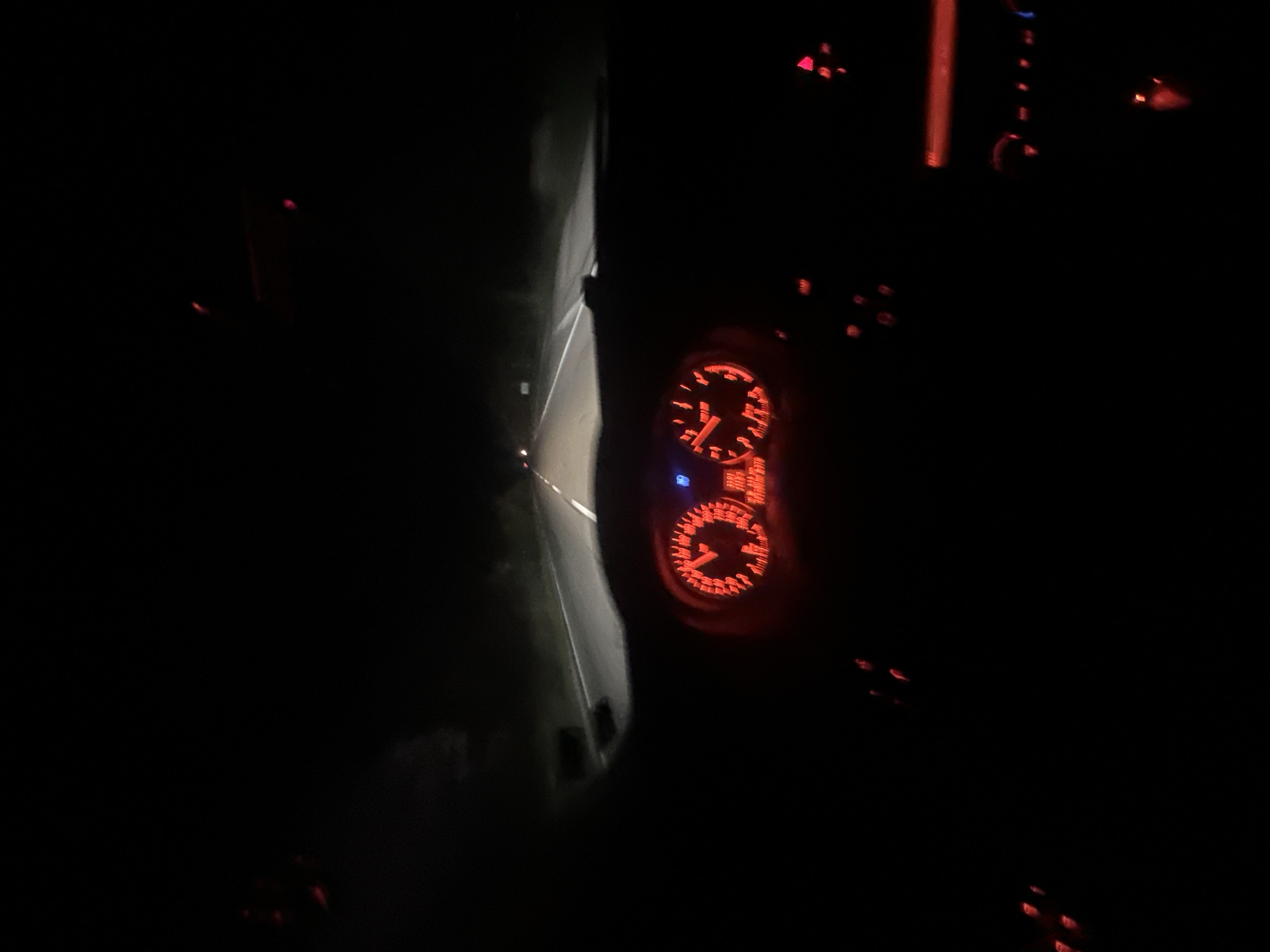 The image depicts the view from inside a vehicle driving on a dark road, possibly in Musachevo, Bulgaria. The dashboard gauges are illuminated in red, indicating the vehicle is in operation. The road ahead is dimly lit by the vehicle's headlights, revealing a dark asphalt surface with white lane markings. The darkness suggests a rural or unlit area. The car’s A pillar is partially visible to the left of the road.