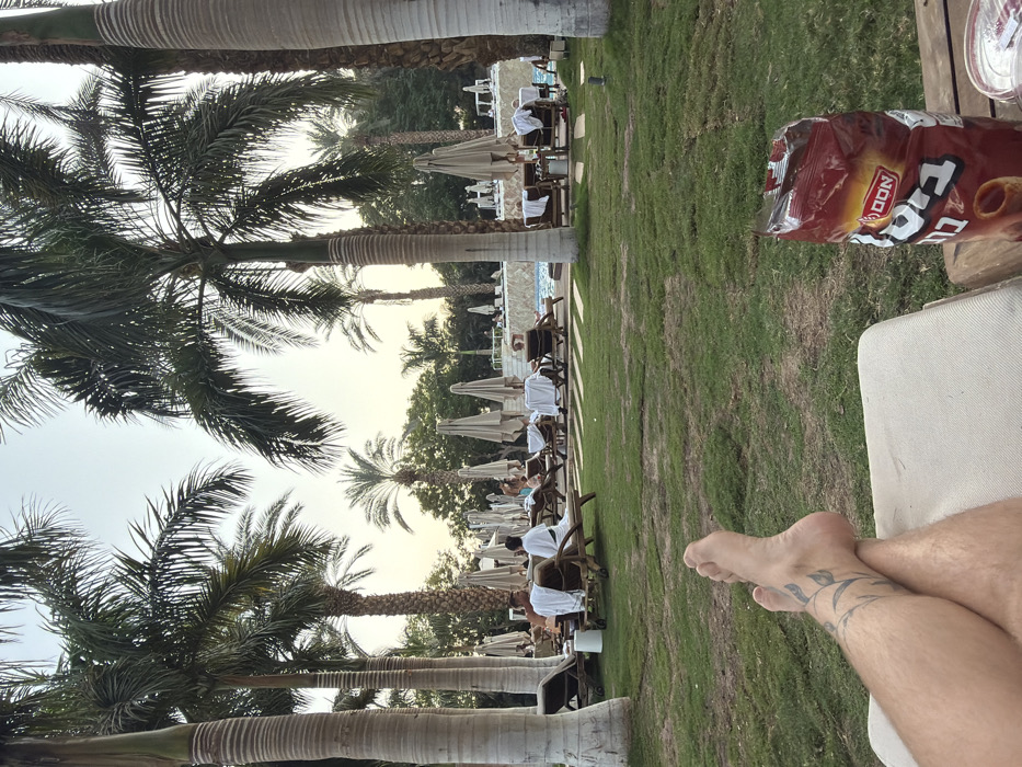 The image depicts a leisure scene in the Tamar Regional Council, Israel, observed from a first-person perspective. In the immediate foreground, a person's bare lower legs, crossed at the ankles, rest on a light-colored padded lounge chair. A dark-ink tattoo, depicting a leafy vine pattern, is visible on the outside of the left ankle and lower shin. To the right, on a low wooden table, an open bag of "Bissli Grills" snack is positioned, its red and yellow packaging displaying Hebrew text and an image of the snack. A clear plastic cup or glass is partially visible next to the snack bag. Beyond the foreground, a manicured green lawn extends towards a resort-style swimming pool area. The pool, featuring light blue tiling, is surrounded by numerous brown lounge chairs and light-colored parasols, many of which appear folded. Several individuals are visible relaxing on these lounge chairs; one man in a dark top and another in a white robe are clearly discernible. White towels are draped over some chairs. The entire scene is framed by numerous tall palm trees with green fronds and pale, textured trunks, creating a shaded environment. Additional foliage and trees are visible in the distant background, under a pale sky indicative of soft light conditions.
