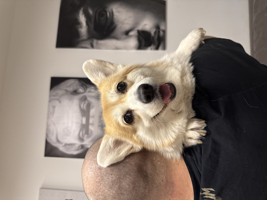 The image captures an indoor scene in Krasnoyarsk, Russia. In the foreground, a Pembroke Welsh Corgi dog, with fawn and white fur, is positioned on the right shoulder of a human individual. The dog is looking directly forward, exhibiting an open-mouthed expression with its tongue slightly visible, and its front paws rest on the individual's shoulder. The human subject's back of the head, neck, and right shoulder are visible; the head is closely shaved or bald, and the individual wears a dark (likely black) short-sleeved t-shirt, on which light-colored dog fur is noticeable. The background consists of a plain light-colored wall with two framed black and white art prints. The print on the left depicts a classical bust of an elderly male figure, consistent with depictions of Karl Marx. The print on the right shows a close-up of a classical human eye and brow, resembling Michelangelo's David. The lighting suggests an interior setting.
