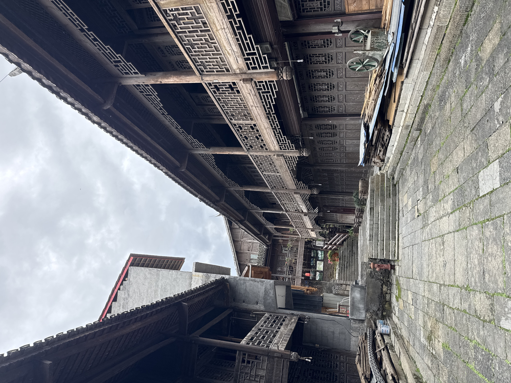 narrow street in Zhuoshui, China. The perspective is angled upwards, emphasizing the architecture. The street is paved with grey stone blocks. On either side, buildings with traditional Chinese architecture dominate the view. The buildings feature intricate wooden lattice work on the eaves and facades. Some sections appear older and weathered, while others show signs of recent construction or renovation. Overhead, there is a cloudy sky. No people are visible in the photograph.