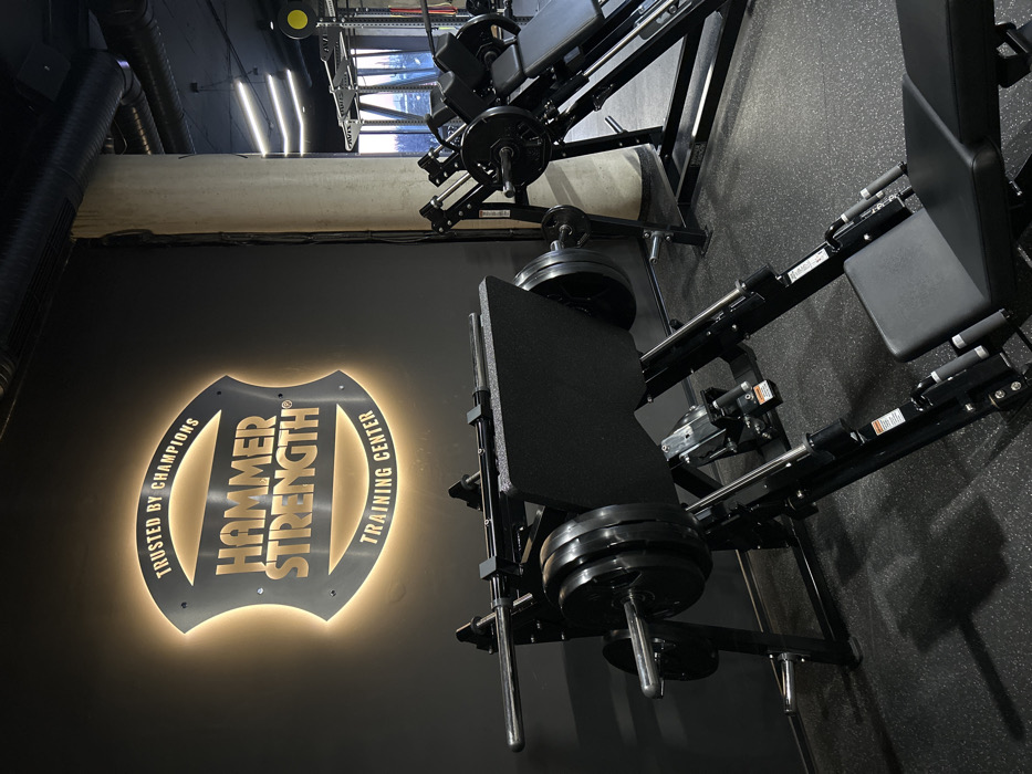 The image displays the interior of a Hammer Strength Training Center located in Plovdiv, Bulgaria