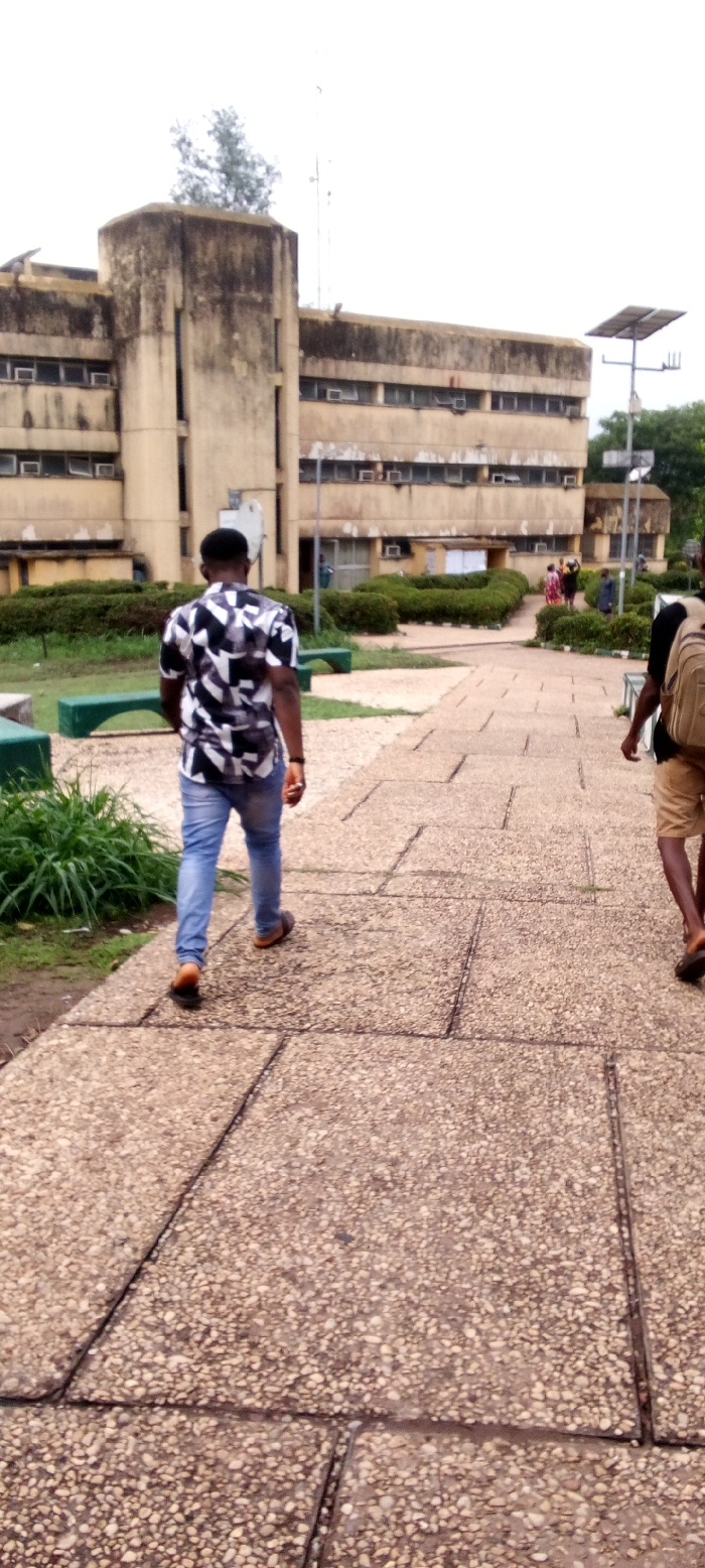 two men walking away from the camera on a pebbled walkway in front of a large, concrete building. The man in the foreground is wearing a black and white patterned shirt, blue jeans, and black sandals. He is walking with his hands in his pockets. The man in the background is wearing a blue shirt and a brown backpack and is carrying a brown bag. Both men are walking toward the building, which appears to be a school or government building. The building has several windows and is made of concrete. The walkway is made of square tiles that are covered in small pebbles. There are some trees and bushes on either side of the walkway. The image was taken in the city of Okigwe, Nigeria, at the coordinates 5.826 latitude and 7.394 longitude.