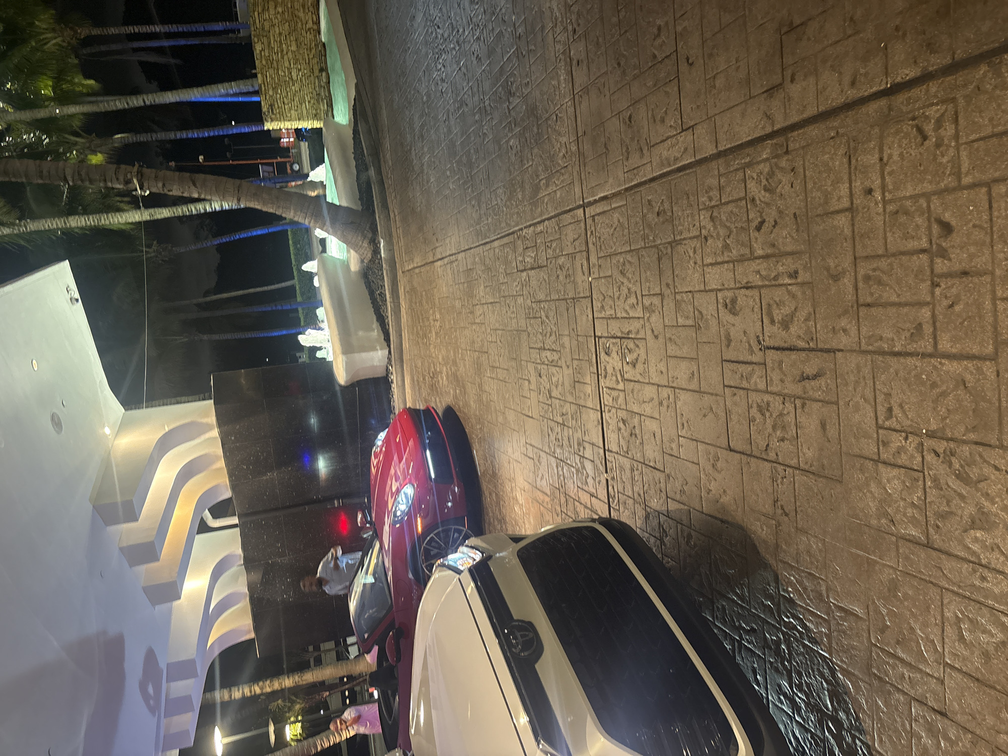 The image depicts a nighttime scene in what appears to be a valet parking area outside a building. A red sports car and a white vehicle are parked on a textured brick-like surface. Palm trees are visible in the background, illuminated by blue lights. A building with white, rounded architectural features and dark vertical slabs is present. A man wearing a light-colored shirt can be seen near the red car. The location is suspected to be in Miami Beach, United States of America, based on the architectural style and vegetation.