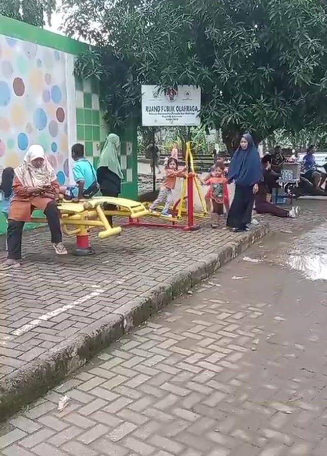 public outdoor space that contains play and exercise equipment. In the foreground, there's a brick-paved area and a line of green grass and shrubs. A yellow piece of exercise equipment with multiple seats is being used by a few children and an adult woman wearing a headscarf. Another piece of yellow exercise equipment is nearby. Several adults and children are visible in the background, and a sign that reads "RUANG PUBLIK OLAHRAGA" is present. There appears to be a painted wall with circular shapes in the background as well. Some water or puddles are on the ground, indicating recent rain. Overall, it's a community space being used by families.