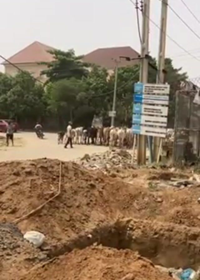 The video depicts a herd of cattle being herded along a dirt road in what appears to be a residential or commercial area