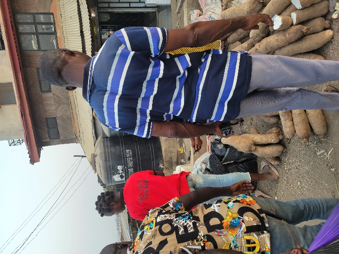 A group of people are gathered around a collection of yams on the ground. One man, wearing a striped blue and white shirt, holds a piece of yam. Another person wears a red shirt. A third individual is seen in a colorful patterned shirt. In the background, there's a water tank, a building with windows, and what appears to be a street scene. The area looks like a marketplace or outdoor vendor location.