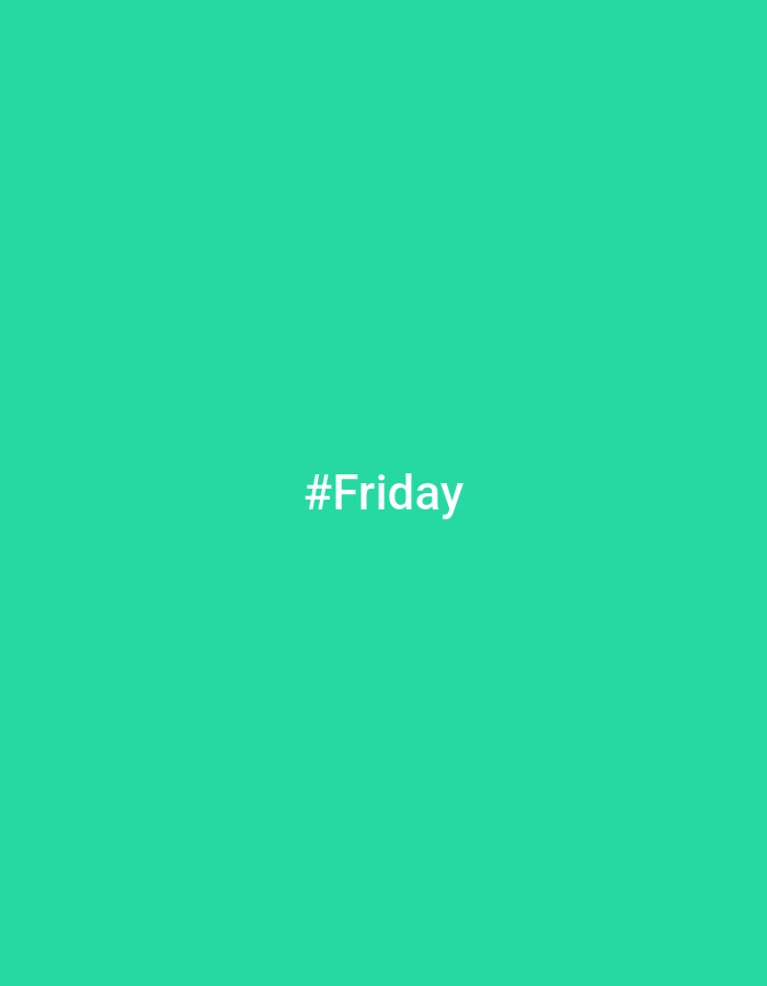 The image displays a uniform, solid teal-green background. Centered both horizontally and vertically on this field is the white text "#Friday," rendered in a sans-serif typeface. No discernible people, subjects, objects, actions, or interactions are present within the frame. The environment is entirely abstract, consisting solely of the colored field and text. The scene is located in the city of Kumarvog, Bangladesh.