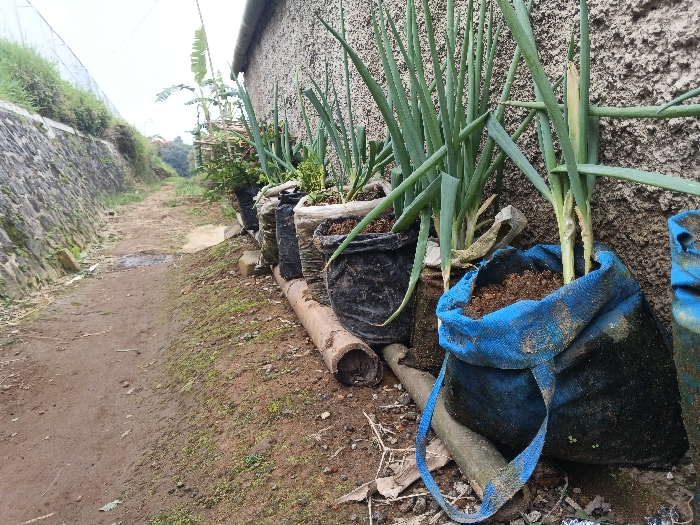 The image displays an outdoor scene in Ho Chi Minh City, Vietnam, featuring an unpaved pathway flanked by a textured wall and a vegetated slope. On the right, a light-colored, stucco-textured wall runs horizontally. Along the base of this wall, a row of approximately seven plants, identified as green onions (scallions), are cultivated in various containers. The foreground shows two blue woven plastic bags, discolored and soiled, each containing dark soil and several green onion stalks. Further along the wall, additional green onion plants are visible in black plastic bags or pots. A rusted, brownish-orange pipe or conduit rests on the ground beneath these containers. The ground in the immediate vicinity of the wall is reddish-brown earth with sparse green weeds. To the left, a reddish-brown dirt path, appearing somewhat moist, extends into the background. On the left side of the path, a retaining wall constructed of stacked stones, partially covered with moss and green vegetation, defines a terraced slope. Above this wall, a verdant, grassy incline rises. The distant background reveals dense green foliage and trees under an overcast sky. No individuals are present in the scene, and no specific actions or interactions are occurring.