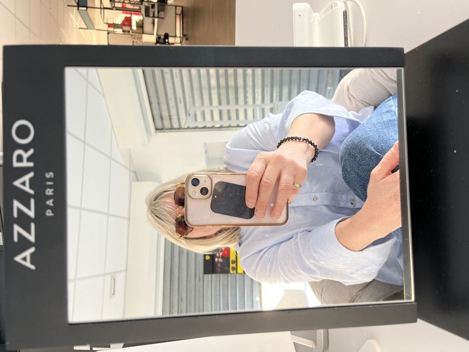 An indoor scene is depicted via a mirror selfie taken by a woman within a retail establishment in Saint-Galmier, France. The central subject is the reflection of a light-haired woman, approximately middle-aged, wearing light-rimmed sunglasses with brown lenses, a light blue button-up shirt, and blue jeans. She is seated, with a light-colored upholstered chair arm visible to her left. Her right hand holds a light-colored smartphone (equipped with multiple camera lenses and a dark rectangular attachment on its back) to capture the image. A silver-colored ring is visible on her left ring finger, and a dark beaded bracelet adorns her left wrist. The selfie is taken in a black-framed, rectangular mirror displaying "AZZARO PARIS" in white text at the top. The reflection reveals the interior of what appears to be an optician's store or a general retail space. The background features white walls, a white ceiling with a grid pattern and recessed lighting. A large window or glass door, covered by metallic roller shutters, is visible behind the woman, suggesting a street-facing facade. To the right of the woman's reflection, multiple-tiered retail display racks, possibly holding eyewear or other merchandise, are visible, along with white counter elements. The overall lighting is bright and even.