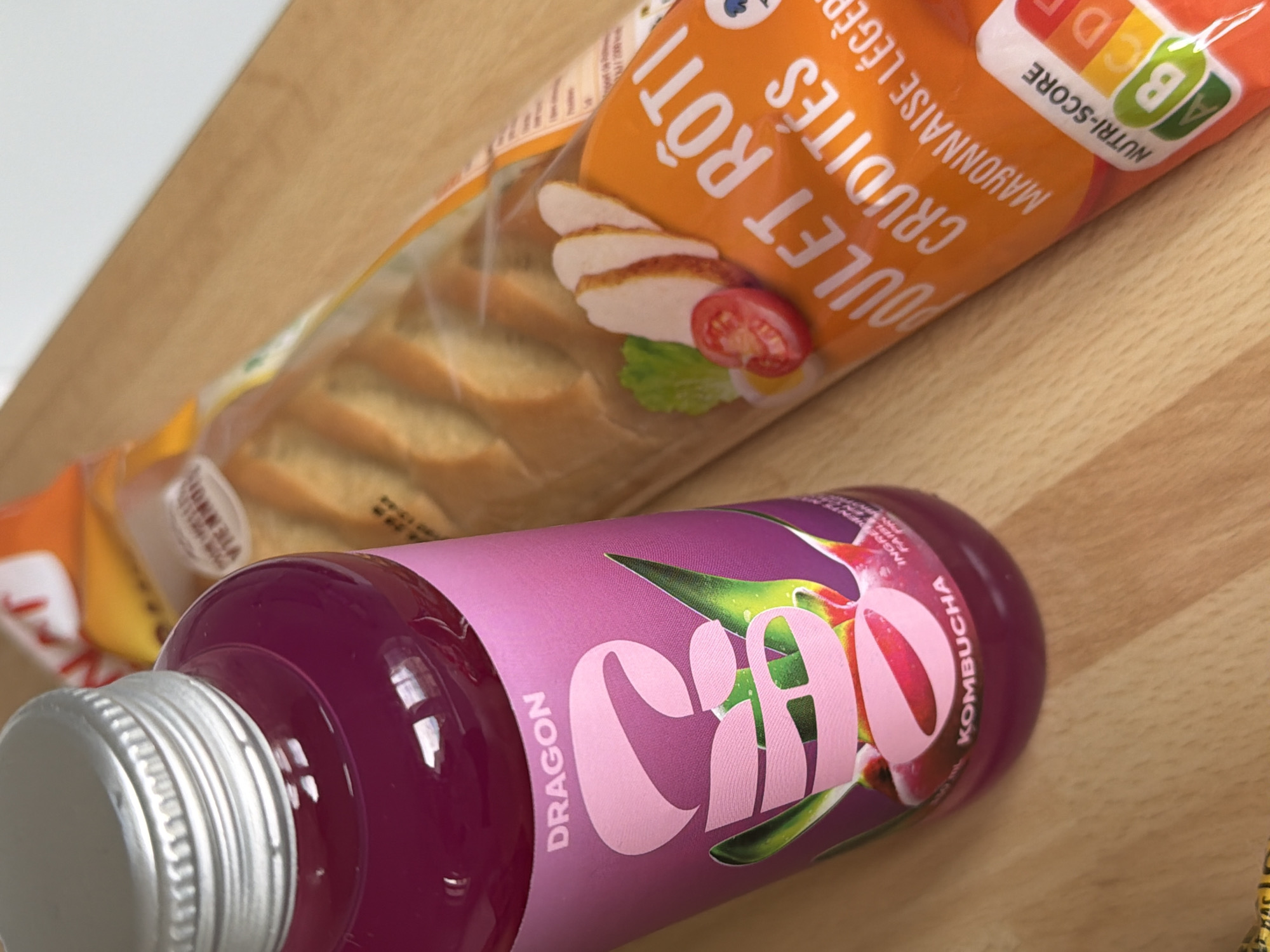 The image displays two packaged food items resting on a light-colored wooden surface, likely a table or countertop, in an indoor setting. No individuals are present. On the left, a clear plastic bottle with a silver screw-on cap contains a purple liquid. Its label is predominantly purple and pink, featuring the word "DRAGON" at the top and "KOMBUCHA" at the bottom. A large, stylized pink "S" logo is prominent in the center, with what appears to be dragon fruit imagery integrated into the design. To the right, a pre-packaged baguette sandwich is visible through clear plastic wrapping. The baguette is golden-brown and pre-sliced. An orange label segment on the packaging displays white text: "POULET RÔTI CRUDITÉS MAYONNAISE LÉGÈRE" (Roasted Chicken, Raw Vegetables, Light Mayonnaise). Visible ingredients inside the sandwich packaging include slices of roasted chicken, lettuce, tomato, and a boiled egg. A "NUTRI-SCORE B" badge is also present on this label. The French language on the packaging indicates that these items are consistent with products available for purchase and consumption in France. While the exact location within Reims, France, cannot be determined from the image alone, the items suggest a grocery purchase or a meal prepared for consumption within the city.