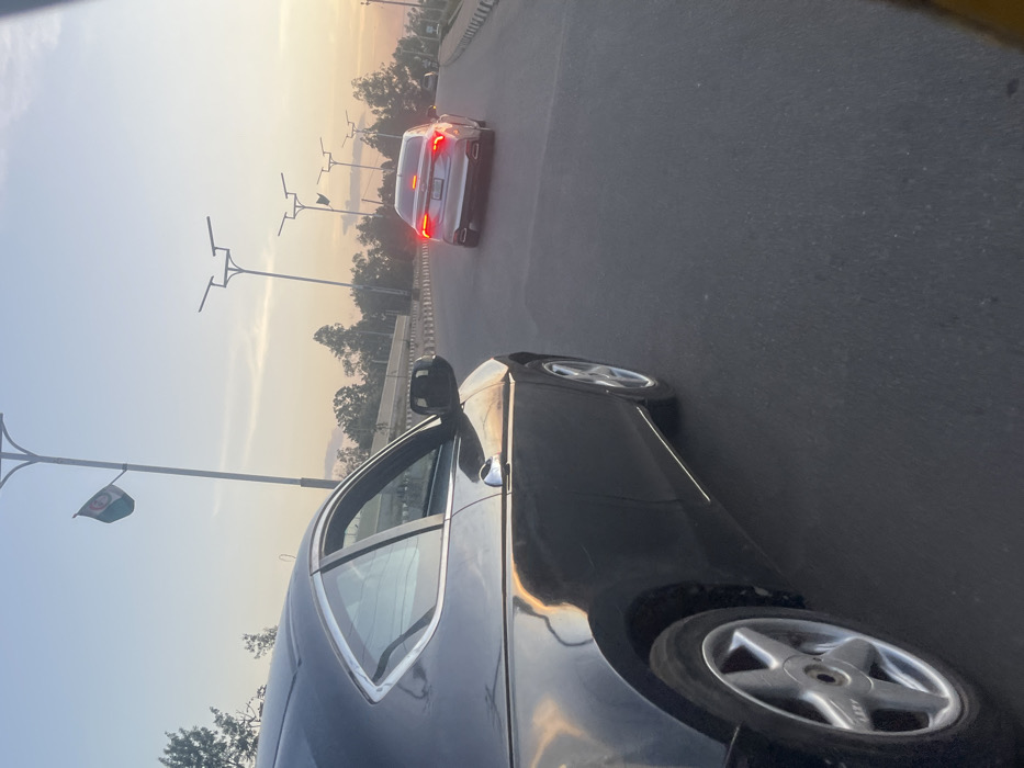 The scene depicts a multi-lane asphalt road in Gura Top, Nigeria, observed at either sunrise or sunset. A dark-colored, two-door coupe is positioned in the foreground on the left, captured from its rear-left quarter. Its silver five-spoke wheels, with "LAZY" text visible on one rim, and reflective body panels are prominent. Ahead in the midground, a light-colored, four-door sedan is traveling away from the viewer, its red brake lights illuminated. The road is bordered on the right by a low concrete barrier and multiple tall streetlights with horizontal arms extending into the distance. Beyond the barrier, dense green trees and foliage are visible. The sky features a gradient of soft orange, pink, and pale blue hues. A flag, predominantly green and white with a central red star and crescent motif, is attached to a streetlight pole in the background on the left side of the road. No individuals are visible.