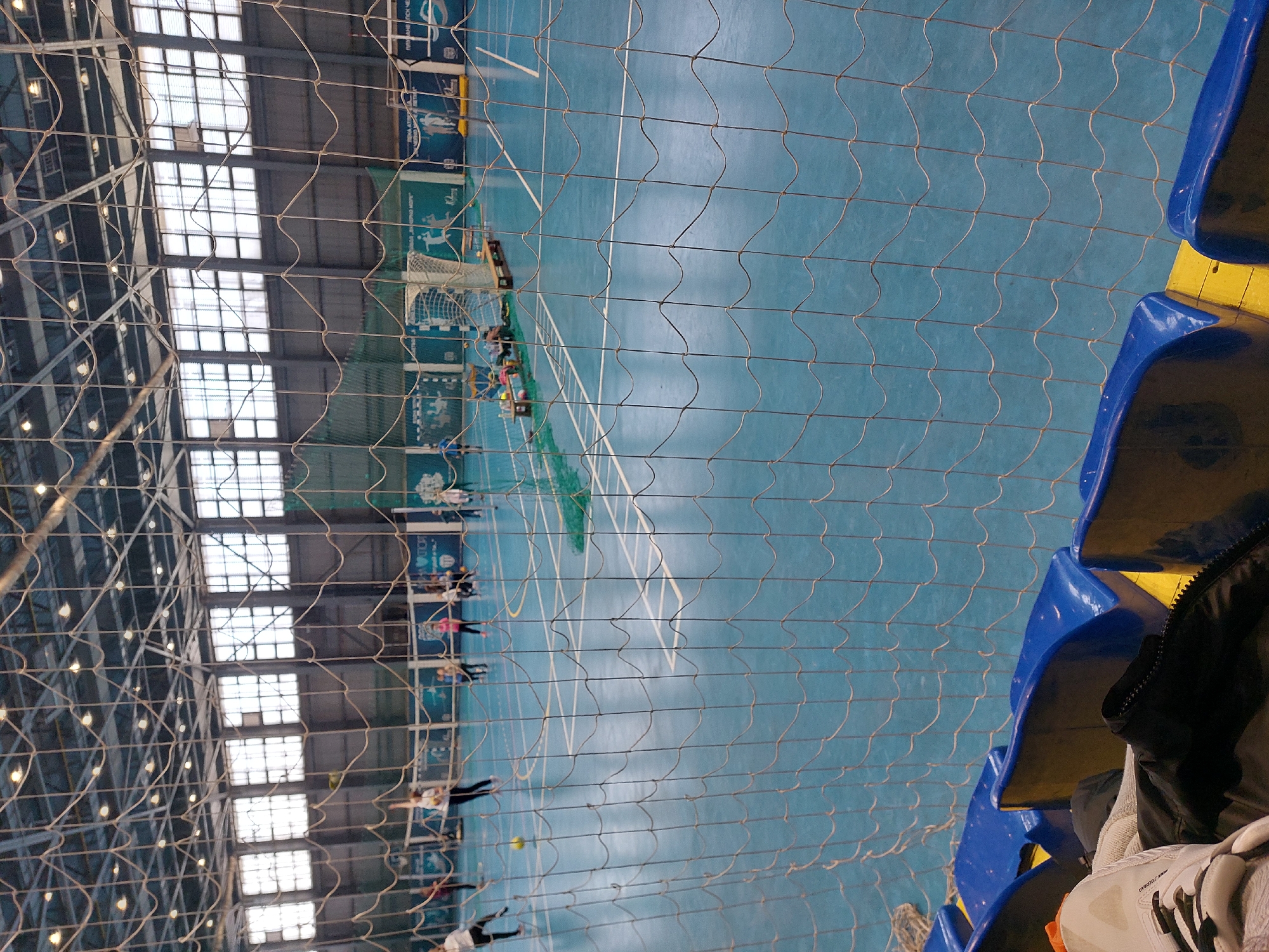 The image displays an indoor sports hall, identified as the Palace of Culture and Sports in Varna, Bulgaria. The scene is viewed from an elevated position within the spectator seating, with a large, off-white mesh net prominently in the foreground, partially obscuring the court. In the immediate bottom left of the frame, several blue plastic stadium seats with yellow support structures are visible. A white athletic shoe with black laces and a black jacket rest upon these seats. The main area depicts a light blue sports court, clearly marked with white lines suitable for games such as futsal or handball. Approximately 10 to 15 individuals, primarily children or young adults, are present on the court, dressed in various athletic attire. One individual, wearing a white top and dark pants, is captured mid-action, extending an arm upwards towards a yellow ball positioned in the air. Other individuals are scattered across the court, appearing to be engaged in active play or training. A handball or futsal goal with a net is visible in the mid-ground on the right side of the court. Near this goal, two individuals are seated on a wooden bench. A separate green net, possibly for volleyball or as a court partition, is also visible on the court surface. The hall's ceiling features a grid of artificial lighting fixtures interspersed with large, multi-paned windows providing natural light. The far wall of the hall displays blue murals with white silhouettes of athletes and Cyrillic text, including phrases such as "ЧЕРНО МОРЕ" (Black Sea), which is a prominent sports club in Varna.