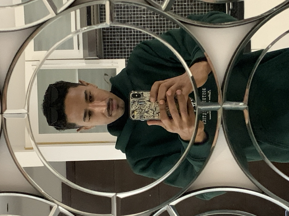 A male individual is depicted taking a selfie in a segmented, decorative mirror, reportedly in Ksar El Majaz, Morocco. The subject has dark, curly hair, a trimmed mustache, and a chin beard. He is wearing black sunglasses perched on his head, a dark green hoodie, and a black turtleneck shirt. He holds a smartphone vertically with both hands, positioned in front of his chest, to capture the reflection. The smartphone has a light-colored, patterned case. Mirrored text on the hoodie's chest is partially visible, indicating "BOSTON" and letters resembling "TICS". The mirror's frame is silver-toned, composed of interconnected circular and semi-circular segments. The reflected background reveals an indoor setting: a light-colored wall or cabinet is visible to the viewer's right of the subject, and to the viewer's left, white cabinetry is positioned above a section of dark, small-square tiling, consistent with a kitchen or bathroom backsplash.