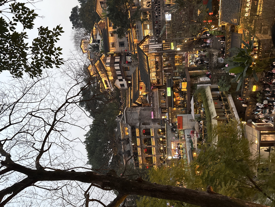 The image depicts a densely constructed hillside settlement in Nan'an District, Chongqing, China, observed during the transition from dusk to early evening. Numerous multi-story buildings, characterized by traditional Chinese architectural styles with tiled roofs and wooden elements, alongside structures featuring more ornate, possibly European-influenced facades (one displaying "BEGONIA"), are terraced along a steep, tree-covered incline. Extensive warm yellow artificial lighting illuminates the buildings, highlighting windows, balconies, and decorative elements such as string lights and multiple red lanterns. A large, bare-branched deciduous tree occupies the left foreground, partially obscuring the lower-middle section of the settlement. Other green foliage is interspersed among and atop the buildings and hillsides. Many buildings exhibit illuminated interiors with visible seating arrangements and outdoor dining areas, some featuring umbrellas, indicative of commercial establishments such as restaurants, cafes, and shops. Numerous individuals are present throughout the scene. They are observed walking along terraced pathways, ascending and descending staircases, and congregating within and around the commercial venues. A significant concentration of people forms a crowd on a broad walkway and staircase system in the lower-right quadrant. A narrow, lit waterway or canal runs through the lower central area, crossed by visible pedestrian bridges. The overall environment presents a lively, densely populated commercial and recreational area.