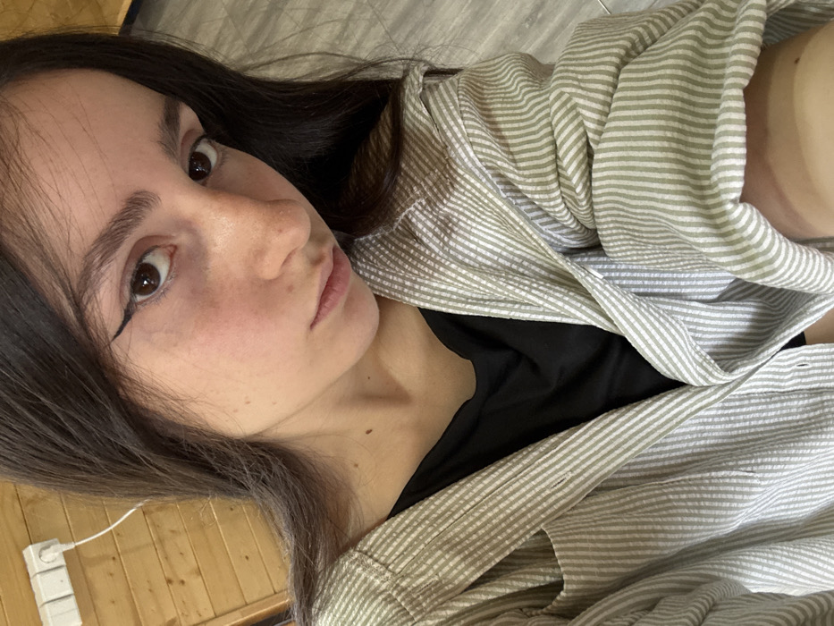 A female subject is depicted in a close-up, chest-up indoor portrait in the city of Voskevaz, Armenia. She has long, dark brown hair, fair skin with visible freckles, dark brown eyes with black winged eyeliner, and a neutral expression. She is wearing an unbuttoned shirt with pale green and white vertical stripes over a black camisole. The background to the subject's upper left features light brown wooden paneling with a white three-receptacle electrical outlet, from which a white cable descends. The background to the subject's right and lower area consists of a greyish-toned floor or wall covering, possibly laminate or tile.