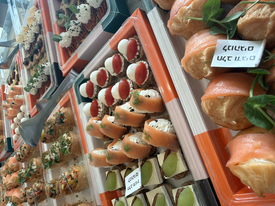 - "The image depicts a close-up, high-angle view of multiple trays of precisely arranged catered appetizers or finger foods, likely in a commercial setting such as a buffet or event in Bnei Brak, Israel" by FM-grnl23, licensed under CC BY 4.0