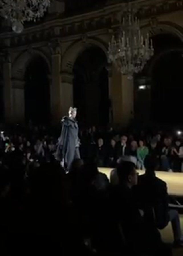 A model stands on a runway, illuminated by a spotlight, while facing away from the camera and towards a seated audience. The model is dressed in a long, dark outfit with a high, possibly metallic, collar or headpiece. The runway is light-colored and contrasts with the dim interior of what appears to be an opulent hall, featuring high ceilings, ornate arches, and large chandeliers. The audience, mostly dressed in dark clothing, watches the presentation, with a few attendees holding up their phones to record or photograph the scene. The overall lighting is low, creating a dramatic and focused atmosphere on the model and runway.