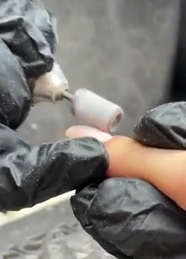 In this close-up shot, a person wearing black gloves is using a small, cylindrical grinding tool to work on a fingernail