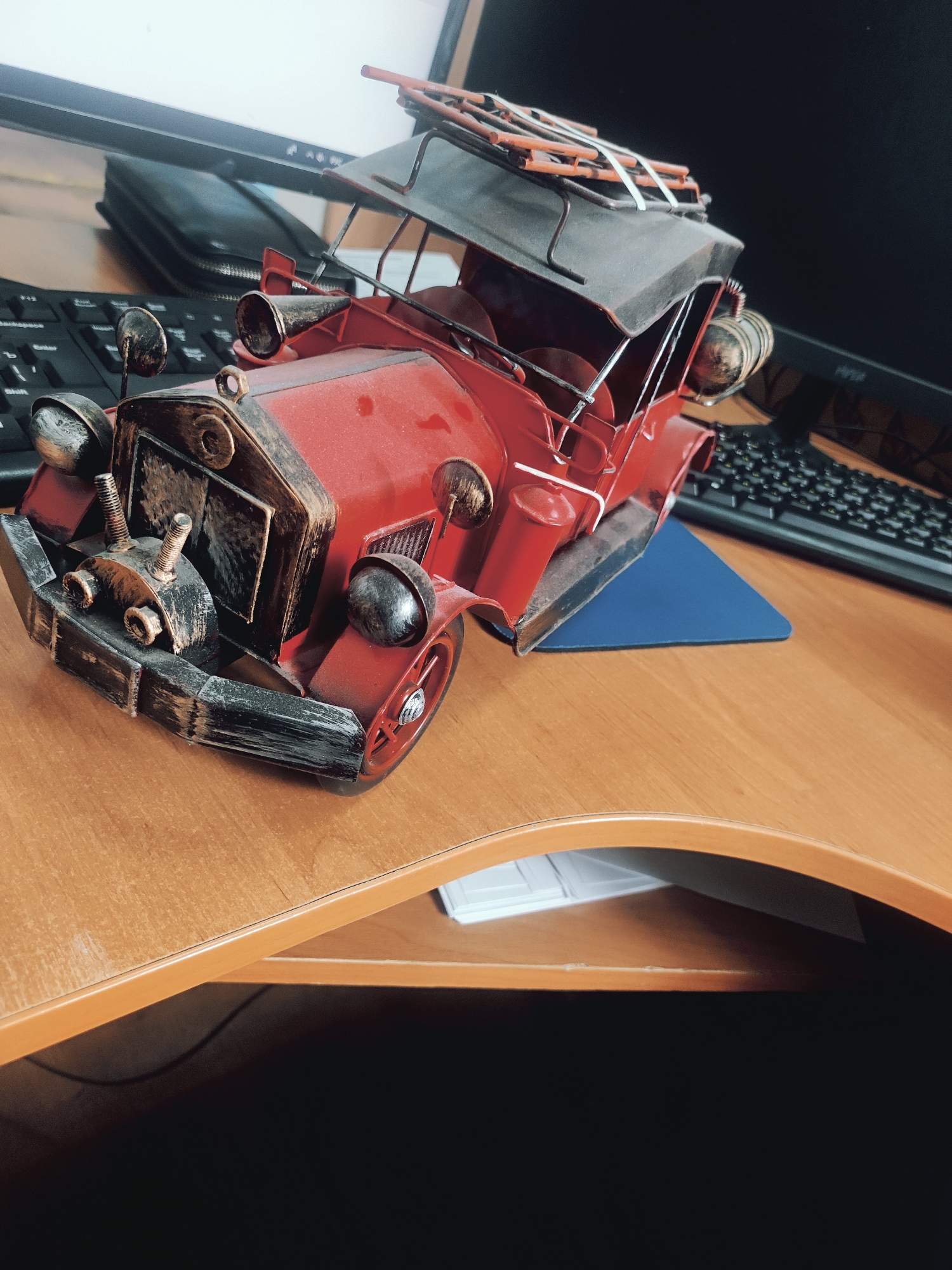 A red, antique-style model fire truck sits on a wooden desk. In the background, there is a keyboard, a black wallet, and a computer monitor. A small, blue stand is underneath the fire truck. The desk has a curved edge with another shelf underneath holding white papers. There are no people in the image. The location is not Donetsk, Ukraine.