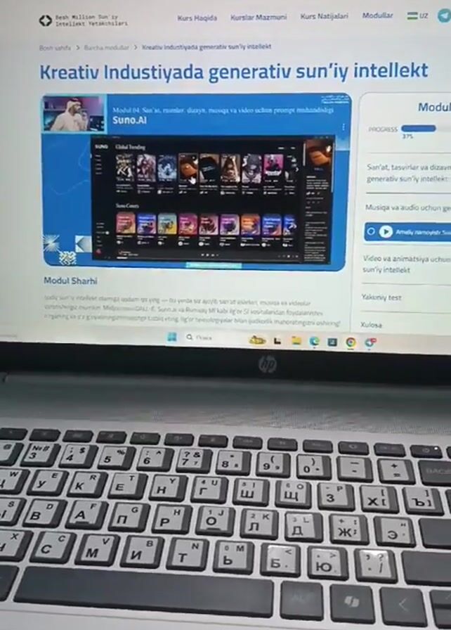 laptop screen displaying a page titled "Kreativ Industiyada generativ sun'iy intellekt" (Generative Artificial Intelligence in the Creative Industry). The screen displays a module on Suno.Ai for creating art, images, design, music, and videos using prompts. The progress bar indicates that the module is 37% complete. The laptop's keyboard is visible in the foreground. The language setting is Uzbek.