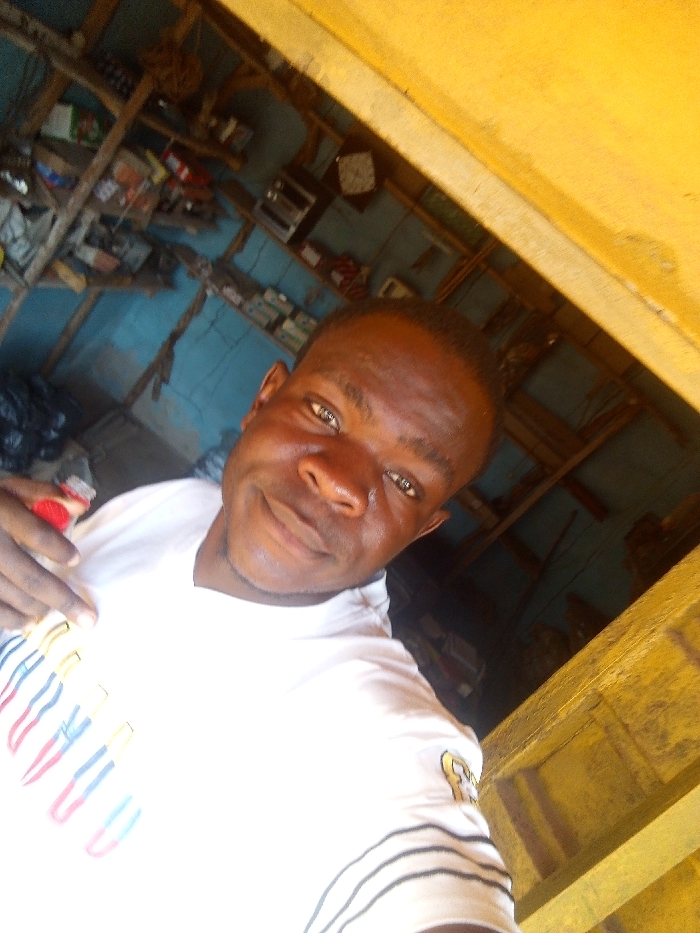 A medium-close-up captures a smiling man, partially visible, wearing a white shirt with colorful designs and stripes on the sleeve. He holds an object in his left hand. The background reveals a cluttered interior with various objects on shelves and a wooden structure with a yellow frame. The room is painted blue. The photo appears to be taken indoors with natural lighting.