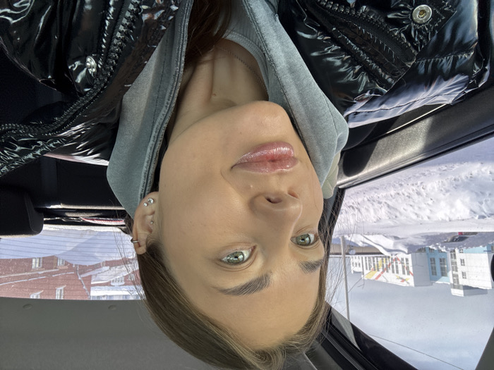 The image depicts a young adult female inside a vehicle, positioned in the rear passenger seat. She is taking a selfie, looking directly at the camera with a slight smile. Her hair is light brown, parted on the side, and her eyes are green. Her lips are full and appear to have a glossy application. She wears a black, shiny puffer jacket over a grey hooded sweatshirt, with a grey t-shirt visible beneath. Her left ear displays a cartilage hoop and two stud earrings. A thin necklace is visible around her neck. The interior of the car is dark, with a black headrest visible in the foreground to the right. Through the car windows, a winter landscape in the city of Chernushka, Russia, is visible under a bright, possibly sunny, sky. To the left, through the side window, a large, light blue and white multi-story building with colorful horizontal stripe designs on its upper facade stands amidst deep snow cover. Snow is heavily accumulated on the ground, indicating a winter setting. To the right, through the rear window, red brick buildings with snow-covered roofs are present, along with extensive snowdrifts.