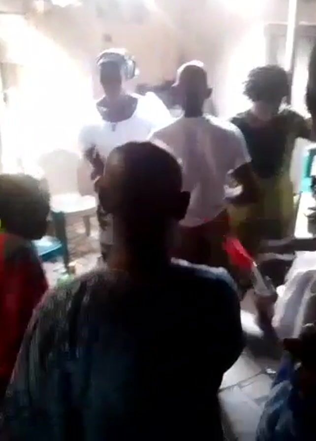 group of people gathered indoors, possibly in a home setting. There are at least eight individuals visible, including women and children. One woman is wearing a yellow dress with an elaborate purple headwrap, while others are wearing white tops. Some individuals appear to be standing, while others are seated. A patterned cloth is draped over a surface in the foreground. The room is lit by natural light coming through a window. It is difficult to discern specific actions or interactions among the group due to the video's perspective and the movement of the camera.