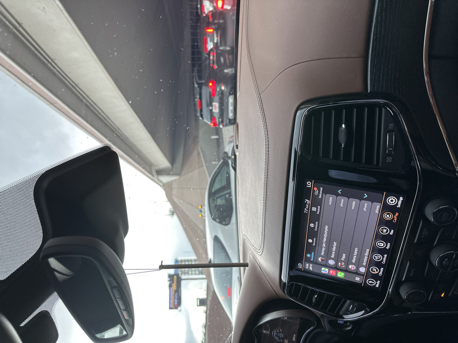 The image depicts the interior of a vehicle, likely in the City of Paradise, United States, looking forward through the windshield at a traffic-congested roadway. The vehicle's dashboard features brown leather stitching and black plastic trim. A central infotainment screen displays "4:06," "73° out," and a contact list including "Honey Jan HarutyunAn," "Rons Market," "Papa," "Alena Karen," and "Armine Rons," with options for calls. Below the screen, control buttons for "Climate," "Controls," "Apps," "Nav," "CarPlay," and "Settings" are visible. A rearview mirror assembly is visible at the top, with a dark, thin object hanging from it. The windshield has small particles, possibly dust or water droplets. Outside the vehicle, a multi-lane road is populated with stationary or slow-moving vehicles under an overcast sky. A silver car is partially visible to the immediate left. Directly ahead, a black BMW SUV with illuminated red taillights is positioned. Further down the road, other vehicles are visible, positioned beneath a large, light-colored concrete overpass structure that spans overhead and to the right. In the far distance on the left, a digital billboard is discernible. No individuals are visible in the scene.