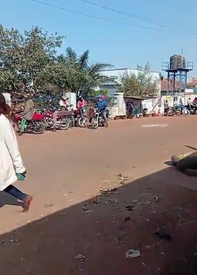 The video depicts a street scene on a sunny day. A woman in jeans, a white sweater, and brown shoes walks across the road from left to right, passing in front of the camera. Several motorcycles are parked along the side of the road. A three-wheeled vehicle (tuk-tuk) drives along the road. The background shows buildings, a water tower, and trees. The roadside area near the camera is littered with trash. The shadow of the person filming is visible in the lower left corner.