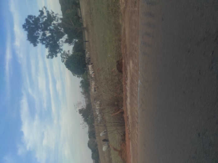 A partially shadowed road dominates the foreground. A grassy verge separates the road from a field containing scattered trees and what appears to be a herd of animals. The sky is filled with blue and streaked clouds, contributing to a rural or natural environment. The photograph is taken at an odd angle.