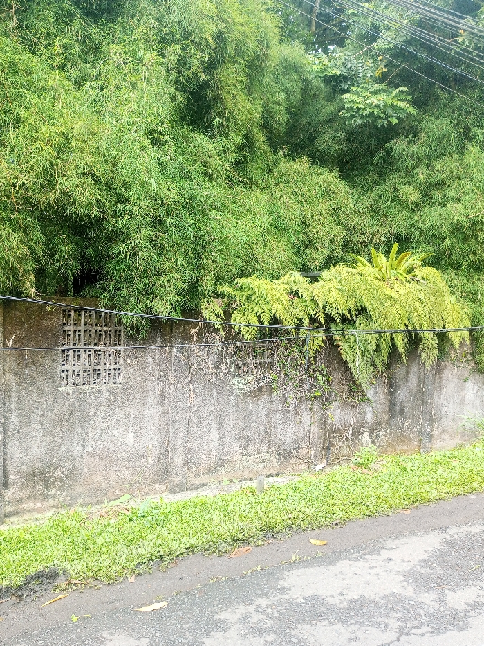 The scene depicts an outdoor environment in Jabalpur, India. In the foreground, the lower portion of a wet, dark asphalt road surface is visible, showing scattered lighter patches and a few fallen brown leaves. Adjacent to the road, a narrow strip of vibrant green grass extends horizontally across the frame. The midground is dominated by a weathered concrete boundary wall, running from left to right. The wall exhibits discoloration, moss, and dirt accumulation. On its left side, two rectangular sections are integrated into the wall, each featuring a grid pattern of openings, suggesting ventilation or decorative elements. Several dark electrical utility wires are strung horizontally across the wall, secured by attachments, passing above the grid sections. Various vines and creeping vegetation adhere to and trail down the wall, particularly to the right of the grid openings. A prominent cluster of lush green ferns, including a larger plant resembling a Bird's Nest Fern (*Asplenium nidus*), cascades over the top right section of the wall. The background consists of a dense thicket of light green bamboo, extending upwards and filling the upper two-thirds of the image, indicating a significant natural growth area behind the wall. Faint utility lines are discernible against the upper foliage on the right side of the frame. No individuals or discernible activity are present within the scene.