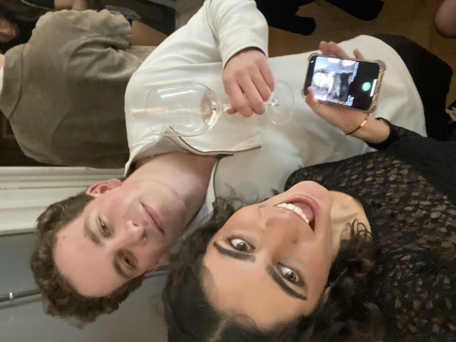 Two people pose for a selfie. A man with light brown hair wearing a white jacket holds a stemmed glass. To his right, a woman with dark hair and eyebrows smiles at the camera, holding a smartphone. The phone screen reflects a scene with a green record button. The woman wears a black lace top. Other people, wearing different garments, can be seen in the background. The photo is taken at an angle.