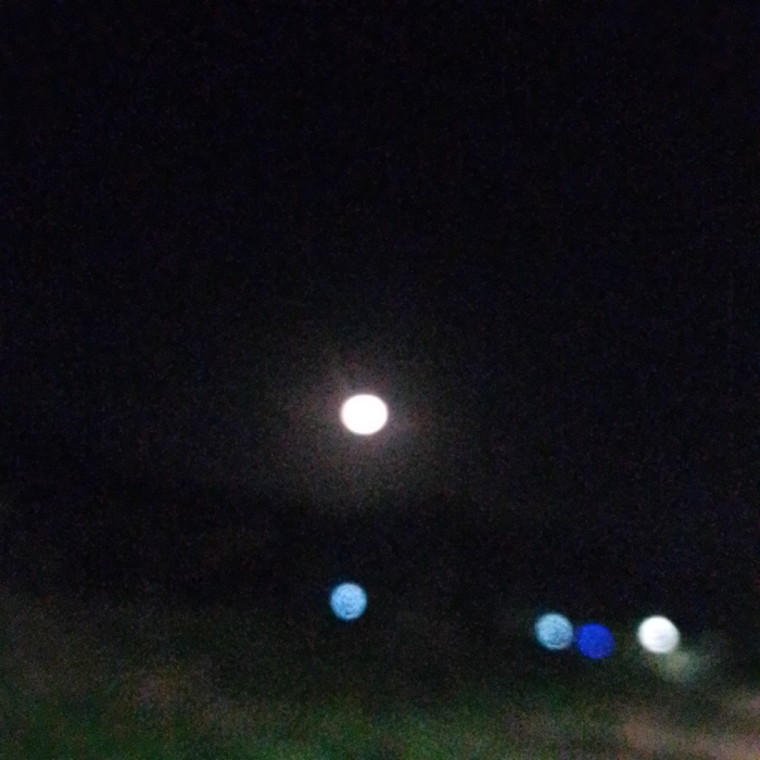 A night scene features a bright, white moon centered in the frame against a dark, overcast sky. Below the moon, a line of blurry, colorful lights appears, mostly in shades of blue and white. A strip of dark green, likely vegetation, is visible at the very bottom of the image, suggesting a ground-level perspective. The image has a slightly out-of-focus quality.